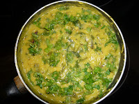 Place a pan on the stove and pour some oil. When it heats up, put mustard seed, cumin seed, curry leaves and cut red chilies. After the mustard seeds starts popping, put ginger and garlic. After 10-15 seconds, add the Malabar spinach that was set aside in to the pan. Fry it for another 10-15 seconds. Add the cooked greengram dal, spinach, onion and turmeric (from cooker).put salt and sugar. When it starts to boil, add coriander leaves and lemon juice and mix it well.